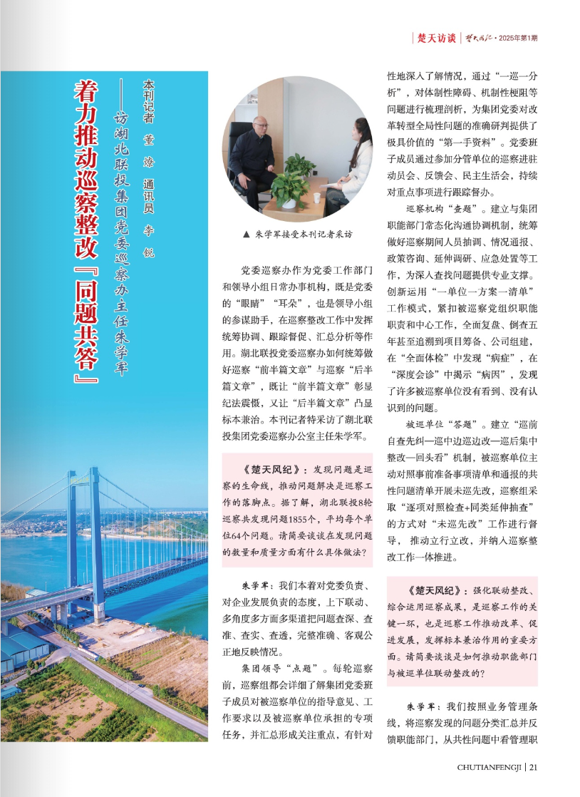 新年伊始,省紀(jì)委監(jiān)委《楚天風(fēng)紀(jì)》編輯部分別專訪集團(tuán)黨委書記、董事長劉俊剛、黨委副書記張艷和黨委巡察辦主任朱學(xué)軍,聚焦打造省屬國企巡察“聯(lián)投樣本”、深化“紀(jì)巡審”聯(lián)動、“同題共答”推進(jìn)巡察整改等主題,深度報道湖北聯(lián)投巡察監(jiān)督護(hù)航企業(yè)改革轉(zhuǎn)型做法經(jīng)驗,并于2025年第一期改版專欄刊發(fā)。集團(tuán)黨委副書記張艷、黨委巡察辦主任朱學(xué)軍訪談內(nèi)容摘要如下。