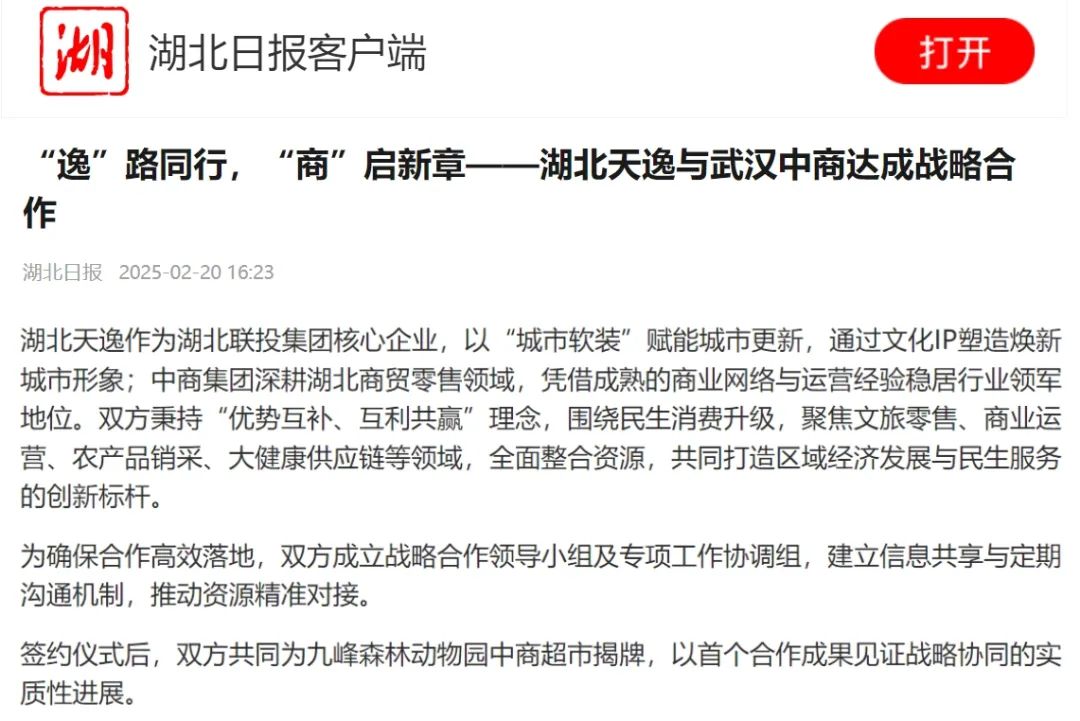湖北天逸作為湖北聯(lián)投集團(tuán)核心企業(yè),以“城市軟裝”賦能城市更新,通過文化IP塑造煥新城市形象;中商集團(tuán)深耕湖北商貿(mào)零售領(lǐng)域,憑借成熟的商業(yè)網(wǎng)絡(luò)與運(yùn)營(yíng)經(jīng)驗(yàn)穩(wěn)居行業(yè)領(lǐng)軍地位。雙方秉持“優(yōu)勢(shì)互補(bǔ)、互利共贏”理念,圍繞民生消費(fèi)升級(jí),聚焦文旅零售、商業(yè)運(yùn)營(yíng)、農(nóng)產(chǎn)品銷采、大健康供應(yīng)鏈等領(lǐng)域,全面整合資源,共同打造區(qū)域經(jīng)濟(jì)發(fā)展與民生服務(wù)的創(chuàng)新標(biāo)桿。