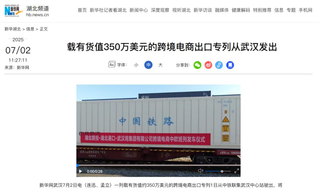 7月1日下午17時,一列滿載湖北聯(lián)投國際經(jīng)合跨境電商商品的出口專列,從武漢吳家山站駛出,沿“漢新歐”國際鐵路干線駛向中東歐核心物流樞紐——波蘭馬拉舍維奇,全程運輸時間預(yù)計18天。專列整合了來自浙江、廣東、河北、江蘇等全國多省貨源,涵蓋工業(yè)品、建材、3C電子產(chǎn)品等多品類。專列的成功開行,標(biāo)志著湖北國際經(jīng)合在拓展跨境物流服務(wù)品類、構(gòu)建消費品出海通道上取得重要突破。